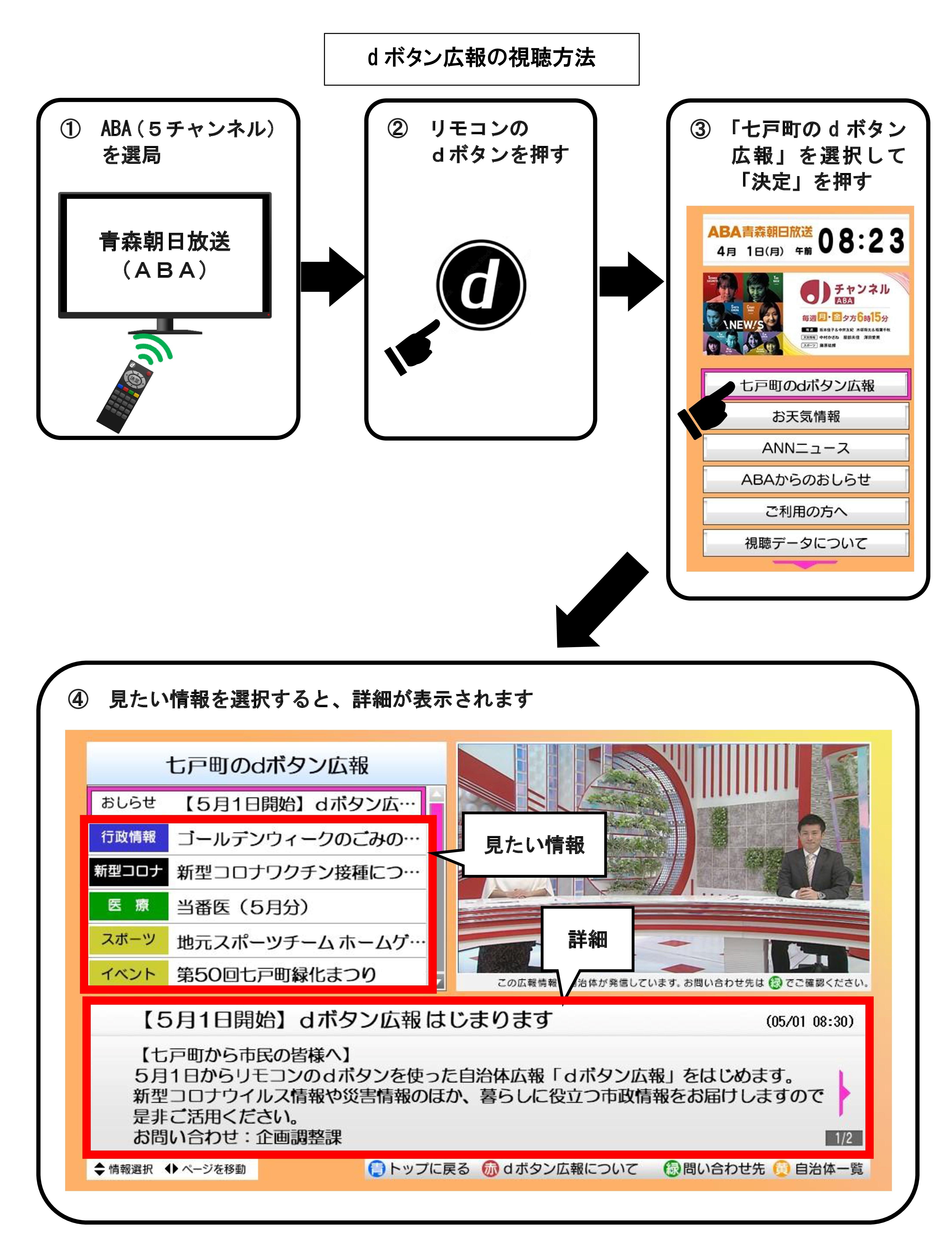 七戸町では、青森朝日放送(ABA)のデータ放送を活用した「dボタン広報」を5月1日から開始します。