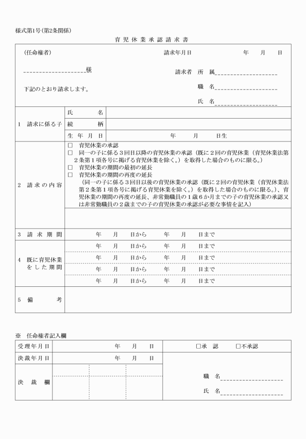 第3条 育児休業の期間の延長の請求は、育児休業承認請求書により行い、条例第3条第7号に規定する職員が任期を更新されることに伴い育児休業の期間の延長を請求する場合を除き、育児休業の期間の末日とされている日の翌日の1月(次に掲げる育児休業の期間を延長しようとする場合は、2週間)前までに行うものとする。