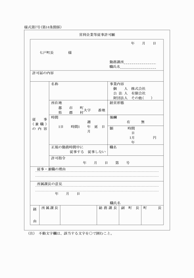 第14条 職員は、地方公務員法(昭和25年法律第261号)第38条第1項に規定する営利企業等の従事許可を受けようとするときは、営利企業等従事許可願(様式第7号)を提出しなければならない。