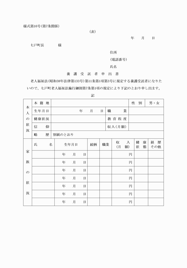 第7条 省令第1条の6の規定による申出は、養護受託者申出書(様式第10号)によりその居住地を管轄する町長にしなければならない。