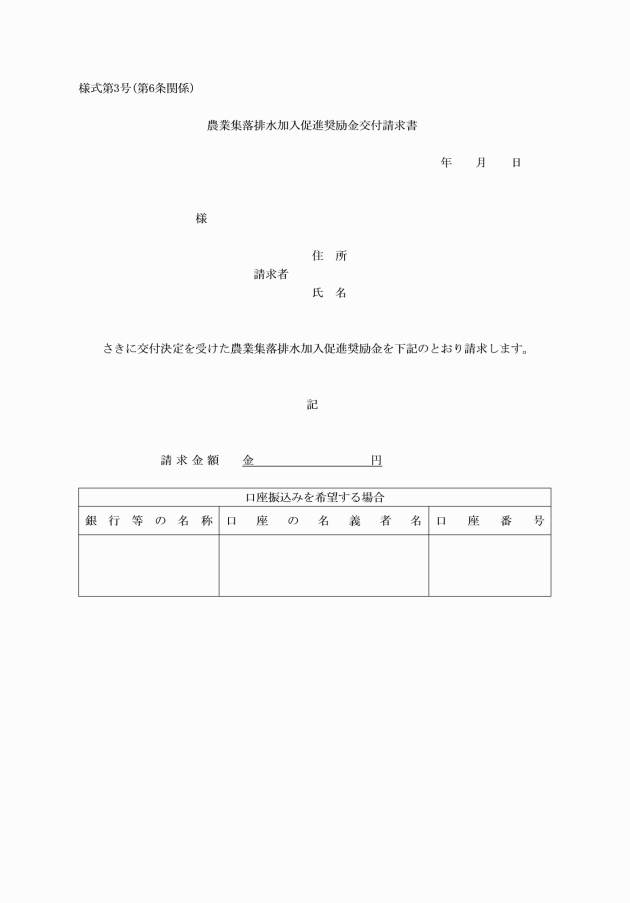 第4条 奨励金の交付を受けようとする者は、竣工検査後5日以内に農業集落排水加入促進奨励金交付申請書(様式第1号)により申請しなければならない。