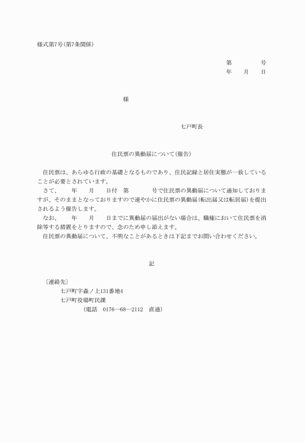 第11条 職権で住民票の消除等を行った場合は、町長は、関係各課に通知するほか、委員会等他の行政機関に対し、様式第10号により通知するものとする。