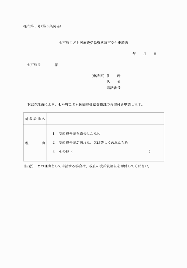 第6条 受給資格者は、受給資格証を毀損し、摩滅し、又は亡失したときは、七戸町こども医療費受給資格証再交付申請書(様式第5号)を町長に提出して、再交付を申請することができる。