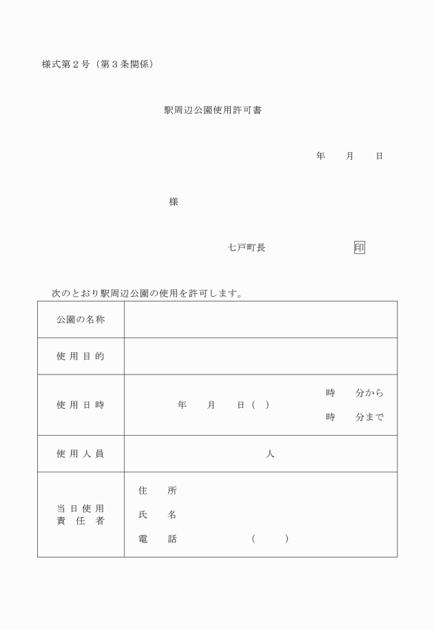 第2条 条例第4条第1項各号に掲げる行為の許可を受けようとする者(以下「申請者」という。)は、駅周辺公園使用許可申請書(様式第1号)を町長に提出しなければならない。