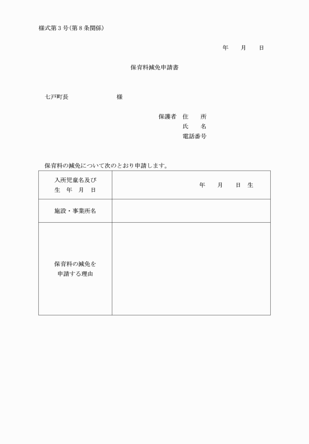 第8条 前条の規定により、保育料の減免を受けようとする満3歳未満保育認定子どもに係る教育・保育給付認定保護者(以下「申請者」という。)は、保育料減免申請書(様式第3号)を町長に申請しなければならない。