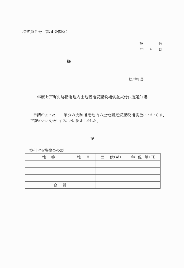 第3条 補償金を受けようとする者(以下「申請者」という。)は、納税後に七戸町史跡指定地内土地固定資産税補償金交付申請書(様式第1号)を七戸町長(以下「町長」という。)に提出するものとする。