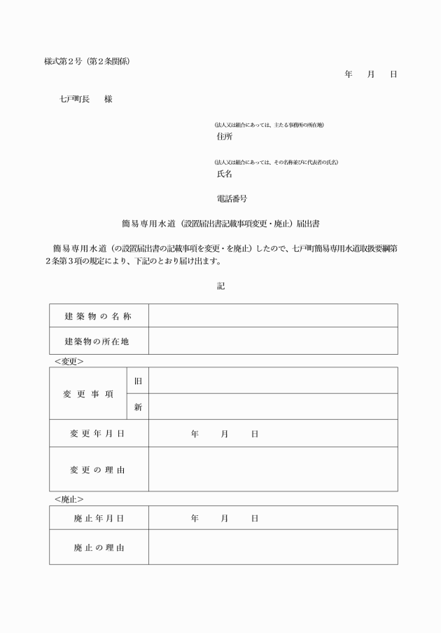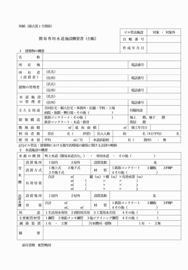 第2条 貯水槽水道のうち、法第3条第7項に規定する簡易専用水道を設置しようとする者は簡易専用水道設置届出書(様式第1号)を、水道事業の管理者の権限を行う町長(以下「管理者」という。)に提出しなければならない。
