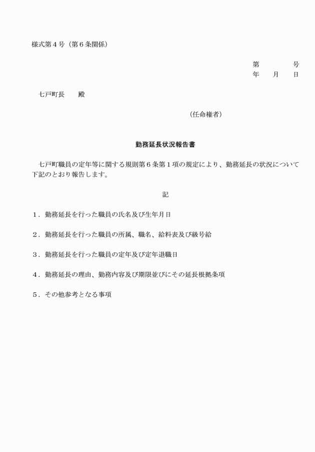 第6条 任命権者は、毎年5月末日までに、前年度に定年に達した職員に係る勤務延長(条例第4条第1項ただし書の規定による町長の承認を得たものを除く。)の状況を町長に報告しなければならない。