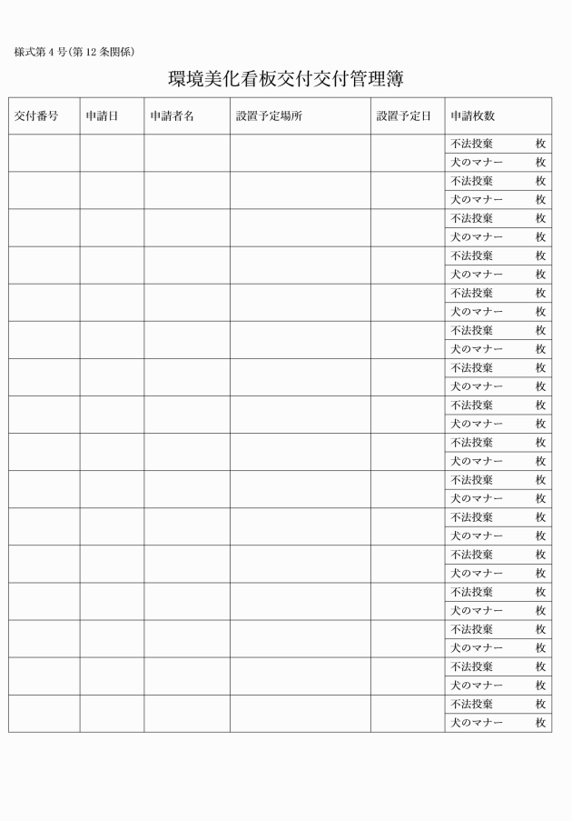 第7条 環境美化看板の交付を受けようとする個人又は団体等は、環境美化看板交付申請書(様式第1号)へ必要事項を記入し次の書類を添付して、町長に提出しなければならない。