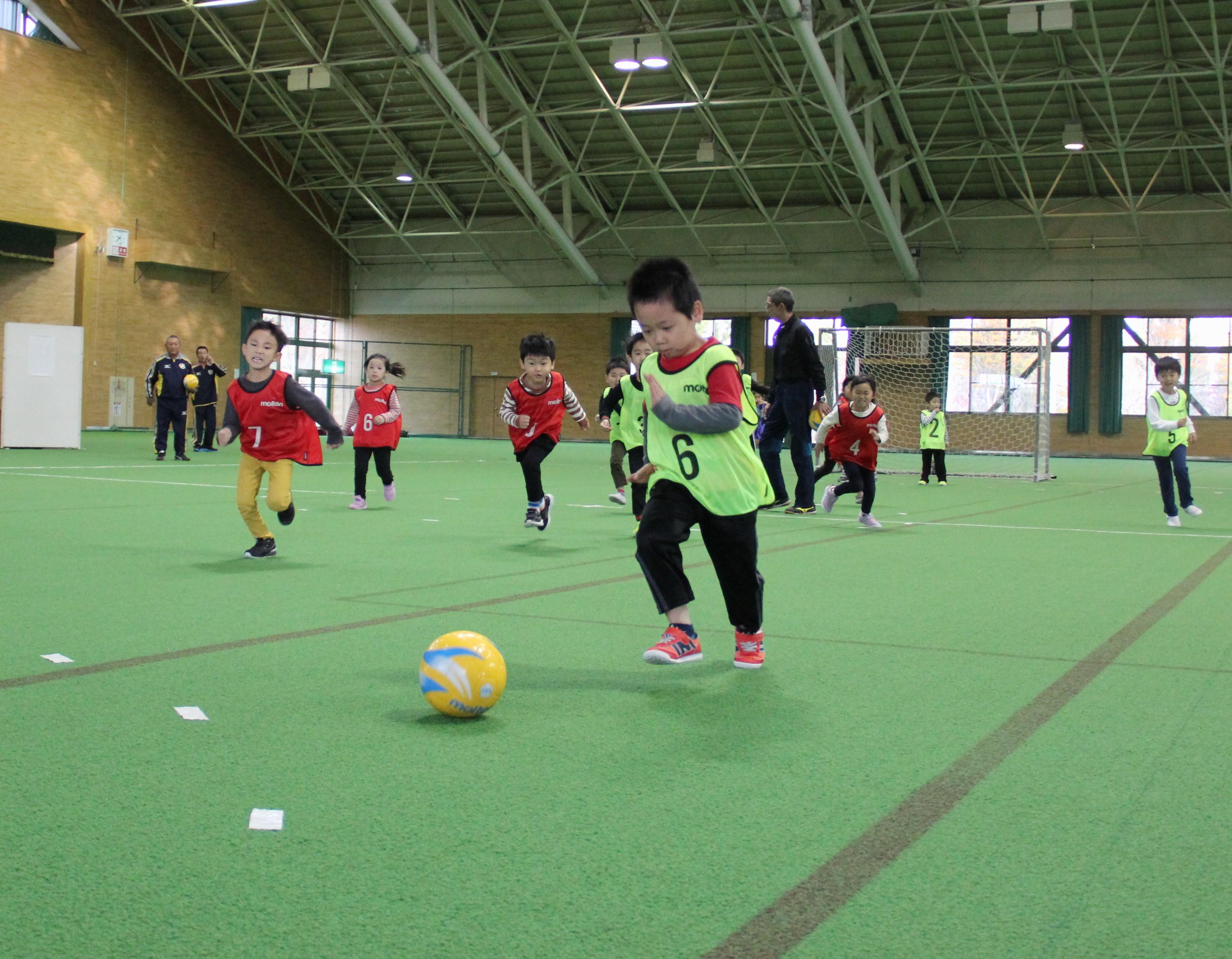 屋内スポーツセンターで11月9日、天間林サッカー少年団(向中野幸八団長)が第10回ちびっこサッカー大会を開催しました。道ノ上こども園・榎林こども園・チビッコるーむの3園が集まり、7人1組のチームとなってボールを追いかけました。応援には保護者や森ノ上地区の老人クラブなどが駆け付け、園児がゴールを決めるたびに大きな歓声が沸き上がりました。